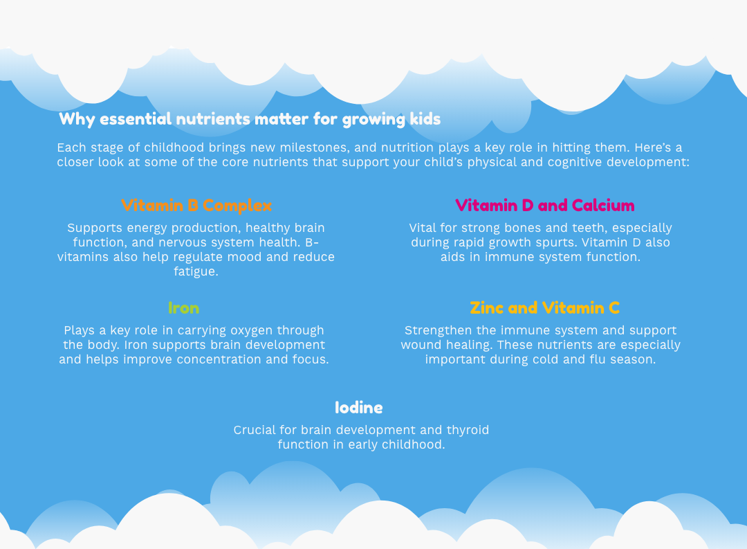 Children’s bodies and brains are developing at a rapid pace, and that growth relies on more than kilojoules. It requires a steady intake of essential vitamins and minerals to support healthy development, learning and energy levels.